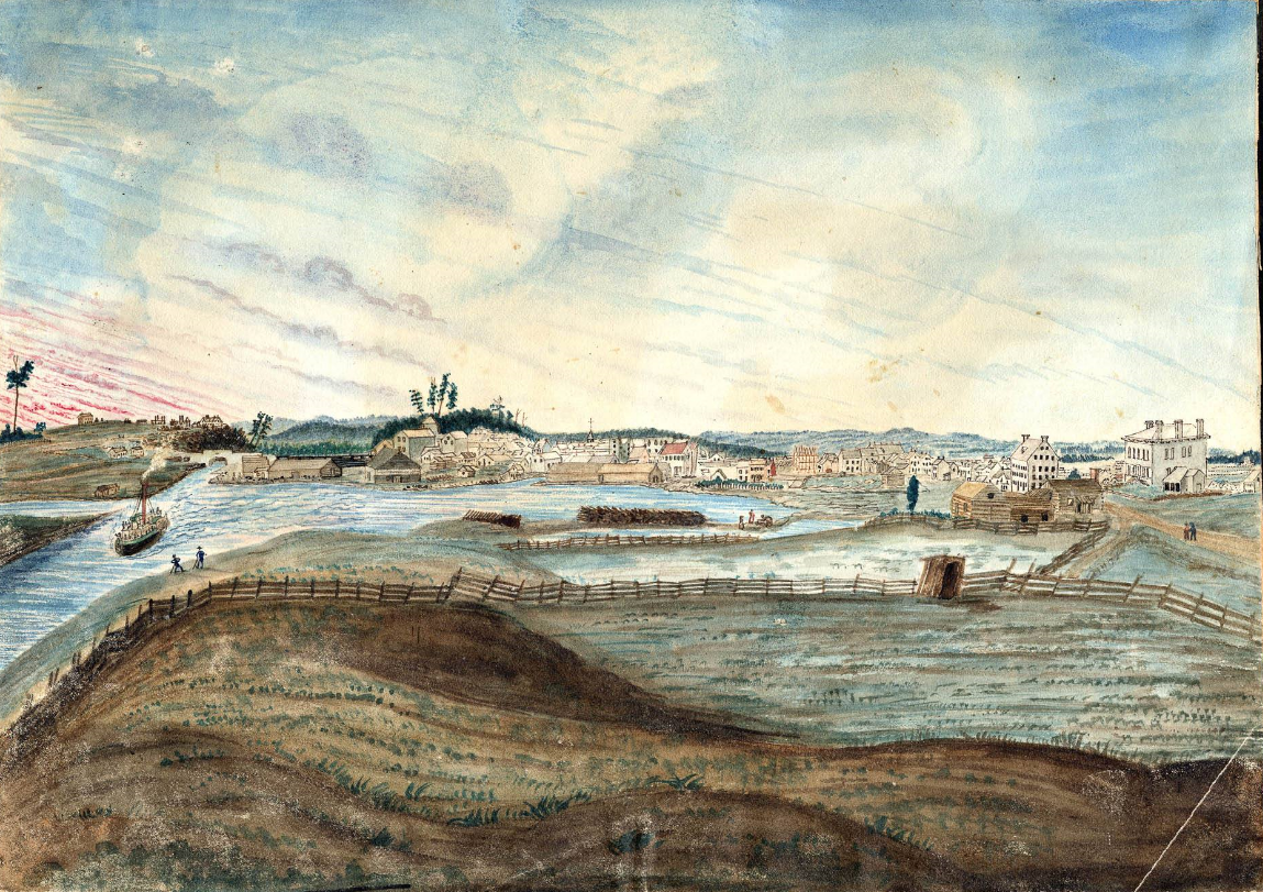 ![Lower Bytown from the east bank of the Rideau Canal c.1845. Map of downtown Ottawa showing the turning basin of the Rideau Canal and the By Wash which was a watercourse that drained out of the basin through market and down King Edward. This is a watercolor of the basin area painted by Thomas Burrowes in 1845. It shows the east side of the canal with the basin and the entrance to the wash. [Source: Lost Ottawa; Archives of Ontario C 1-0-0-0-12]](photos/Lower%20Bytown%201845.png)