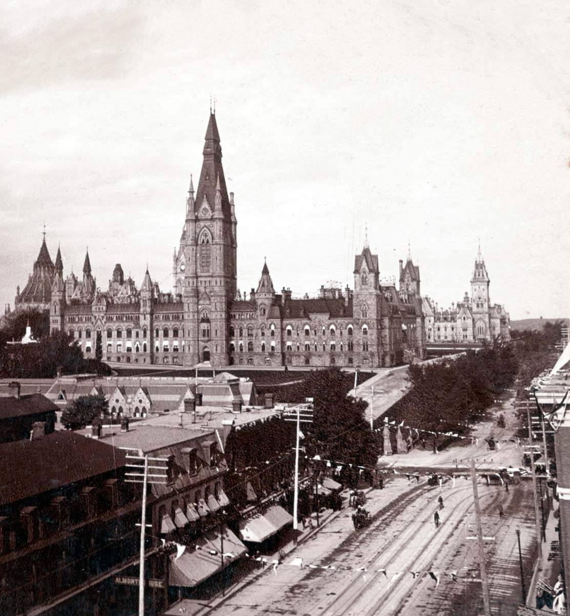 ![Wellington looking northeast towards the Parliament Buildings, circa 1901. Vibrant businesses lower left once occupied the north side of Wellington. Beyond them, the Old Supreme Court Building and the greenhouse below West Block can be seen. [Source: Library of Canada, Keystone View Company 1s18386u]](photos/Wellington%20Street%201901.jpg)